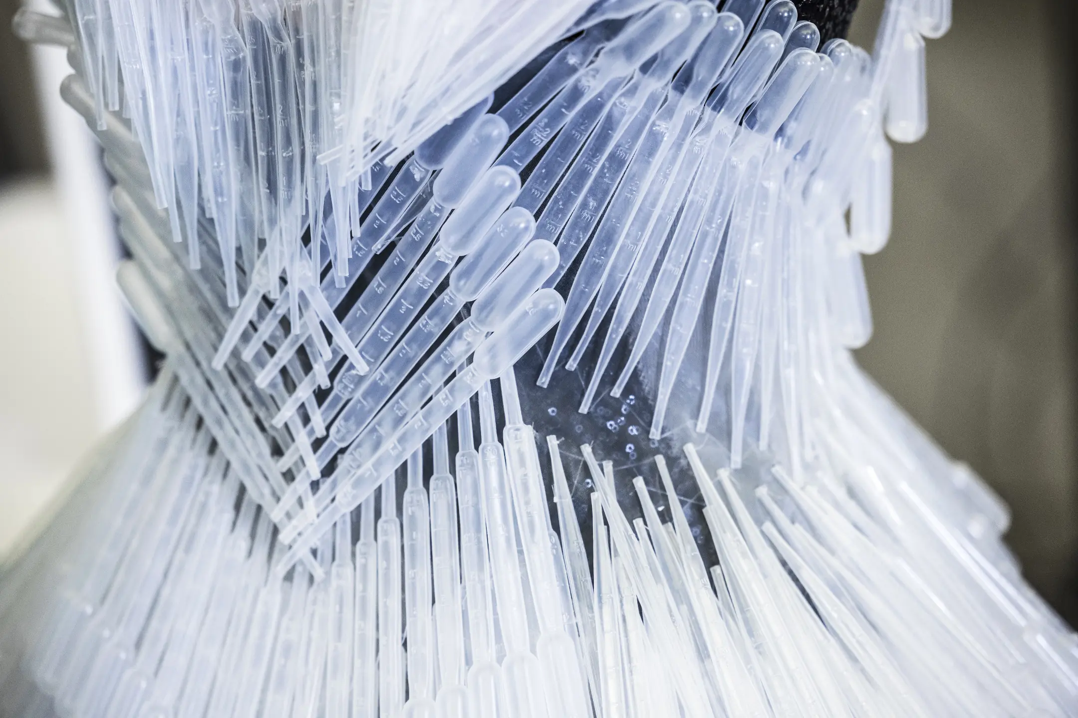 The three participating labs who collected the pipettes consume 100 to 150 of them per lab each week. Collection ran from October to December 2024. About 4,000 pipettes were donated but not all were used in the making of the dress.
